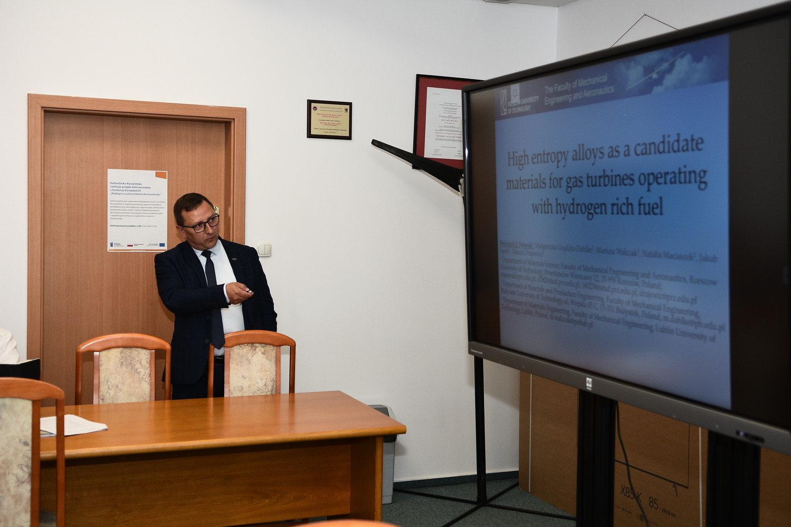 W dniu 13 czerwca 2023 został wygłoszony wykład pt.: “High entropy alloys as a candidate materials for gas turbines operating with hydrogen rich fuel” podczas konferencji 11th International Workshop on Surface Engineering, 7th International Workshop on Applied and Sustainable Engineering, 2nd International Workshop on Trends in Electronics and Informatics w Koszalinie, Polska. Wykład zawierał wstępne wyniki uzyskane w projekcie na stopach wysokiej entropii HEA będących przedmiotem badań projektu. Prelekcja spotkała się z mocnym zainteresowaniem ze strony słuchaczy i zaowocowała burzliwą dyskusją. Liczba słuchaczy: około 50.